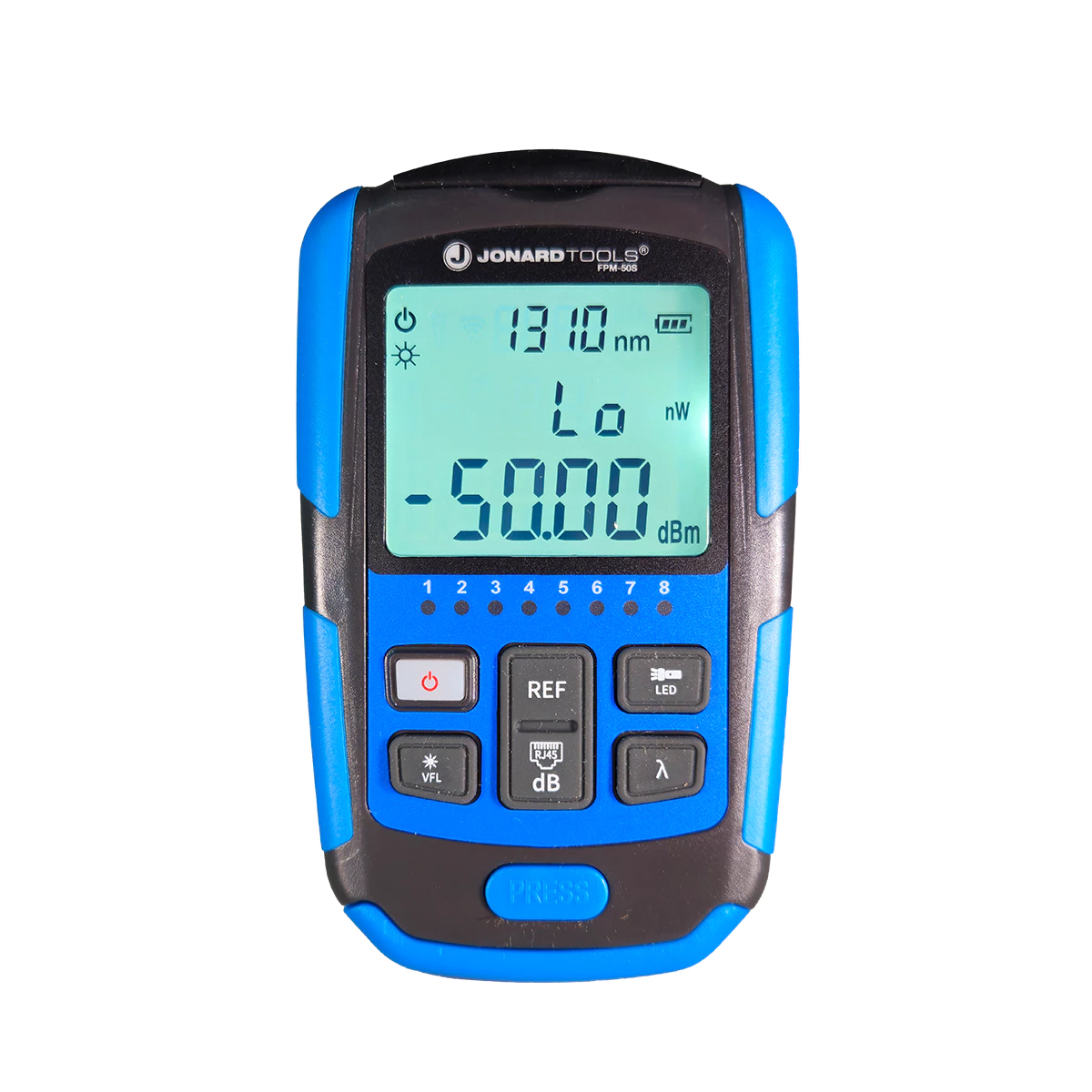 Mide 10 longitudes de onda calibradas preestablecidas con alta precisión para determinar la potencia absoluta o relativa La pantalla LED tiene retroiluminación para ver en lugares con poca luz y un apagado automático de 10 minutos ayuda a preservar la vida útil de la batería. VFL integrado de 2 mW. Prueba cables de red conectorizados RJ45 usando el control remoto incorporado. Viene con adaptadores FC y LC para que los conectores de fibra se puedan conectar directamente a la herramienta. Los adaptadores FC/SC son para conectores APC/PC/UPC